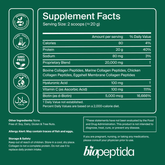 Biopeptida™ Advanced Collagen Peptides – Multi Collagen Powder (Types I, II, III, V & X) – Hydrolyzed – With Hyaluronic Acid + Vitamin C & Biotin – Unflavored