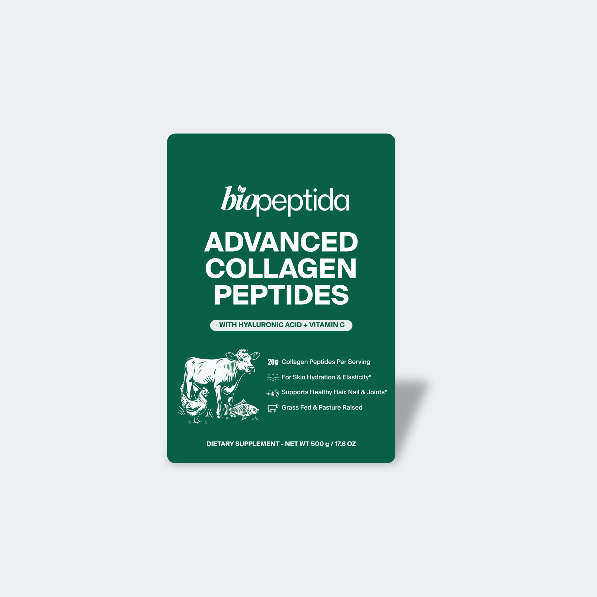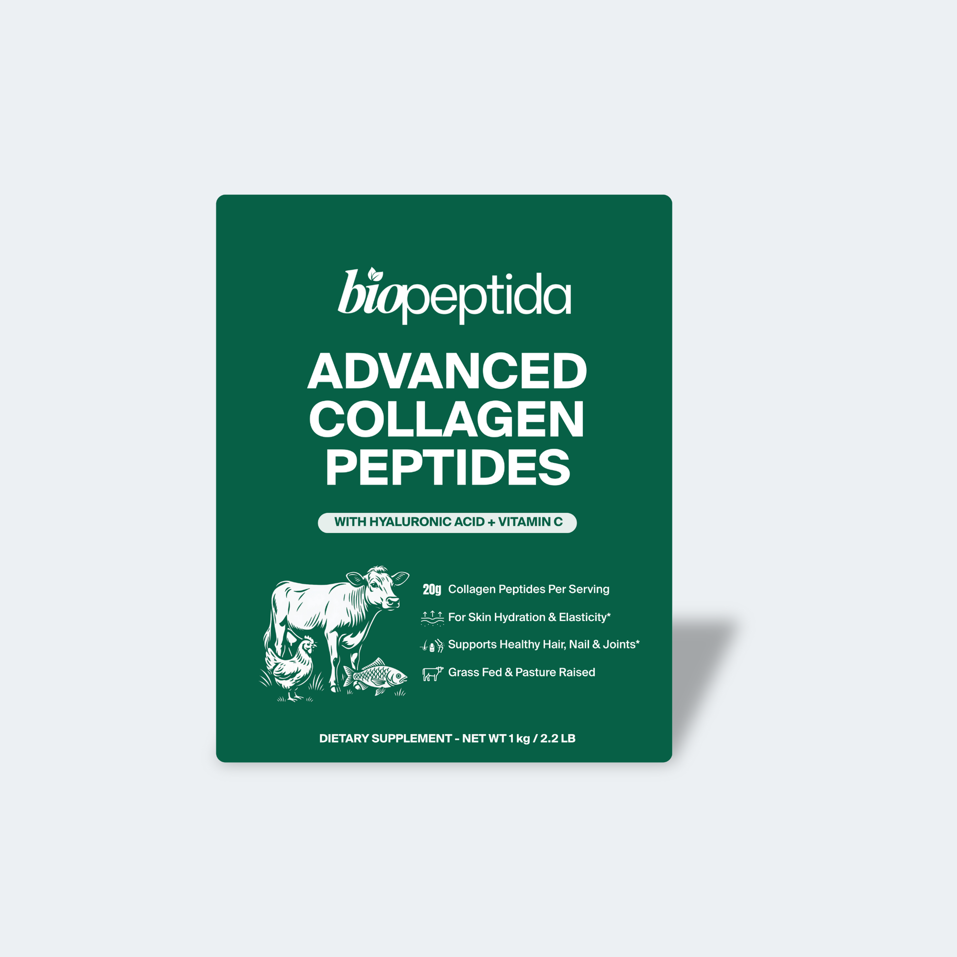 Bio Peptida’s Advanced Collagen Peptides combine five scientifically studied collagen types — I, II, III, V & X — to deliver complete support for your skin, joints, hair, nails, and muscles. Powered by bioactive ingredients like Hyaluronic Acid, Vitamin C, and Biotin, this formula works from within to restore, strengthen, and rejuvenate.